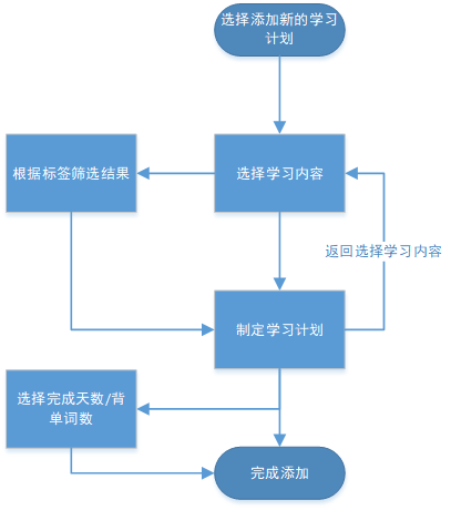 备选流1:返回选择学习内容;备选流2:根据标签筛选结果;备选流3:选择完成天数/背单词数;