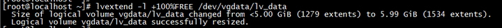 # lvextend -l +100%FREE /dev/vgdata/lvdata