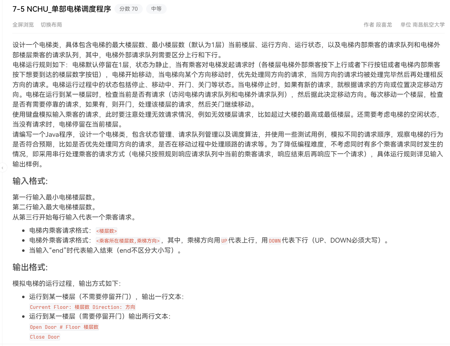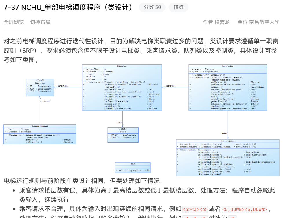 难度上,三道题目呈现出阶梯式上升的特点。第一道题要求设计一个包含多种属性和方法的电梯类,实现基本的电梯调度功能,属于中等难度,重点在于对电梯运行逻辑的梳理和代码实现。第二道题在第一道题的基础上进行迭代,引入多类设计,遵循单一职责原则,不仅要考虑电梯调度逻辑,还要合理划分各个类的职责,处理无效请求和重复请求,难度有所提升。第三道题再次迭代,加入乘客类,改变乘客请求输入方式,进一步复杂了请求处理逻辑,同时要保证电梯运行规则的正确实现,属于较难级别,对综合编程能力提出了更高的要求。