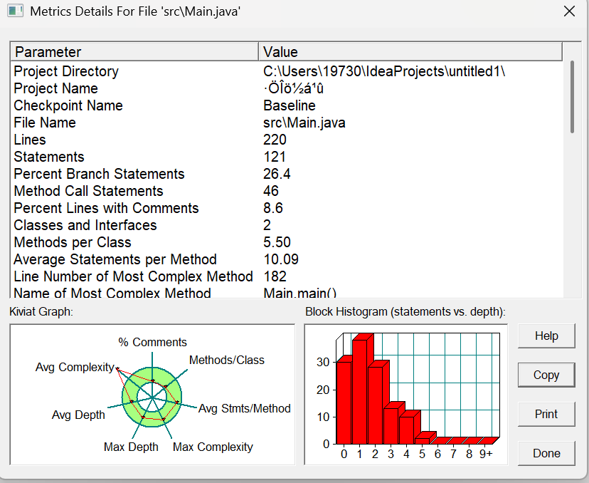 最大复杂度(Maximum Complexity):为 8,出现在 Main.main() 方法中。复杂度达到 8 表明该方法的逻辑相对复杂,可能存在较多的条件判断、循环或嵌套结构。较高的复杂度会使方法难以理解和调试,后续在对该方法进行修改或扩展时,需要特别小心,以避免引入新的错误。