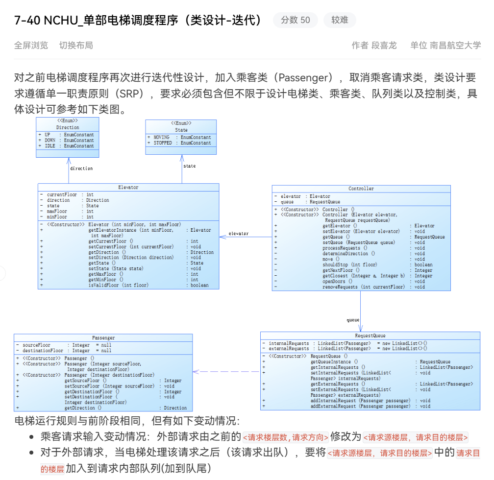 这一次的题目是对上一次题目的迭代优化,目的是满足类的单一变量原则,解决电梯类职责过多的问题。
