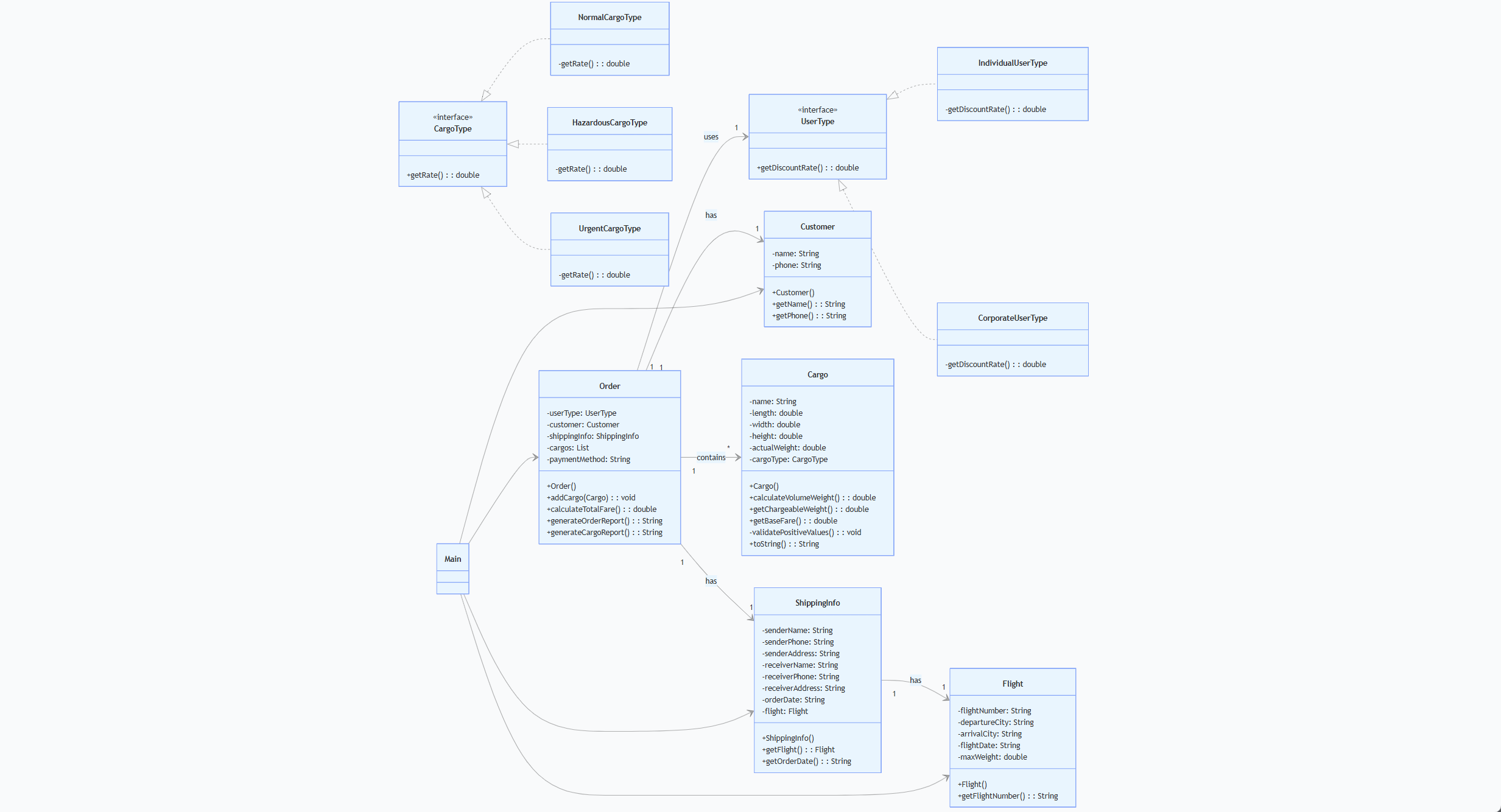 类之间通过组合 / 关联关系协作(如 Order 包含 Customer、ShippingInfo 和 Cargo 列表),符合合成复用原则。