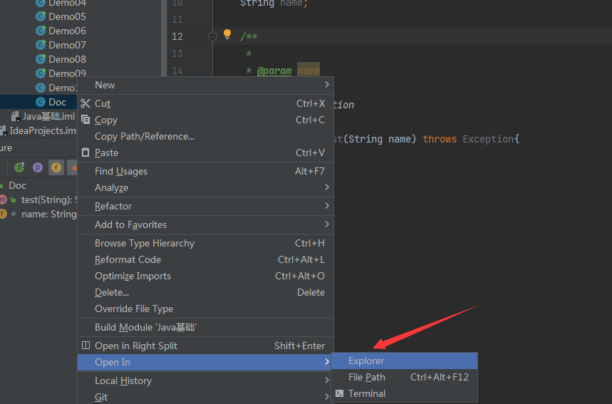 在文件夹中打开:右击类-->选择【open in】-->【Explorer】