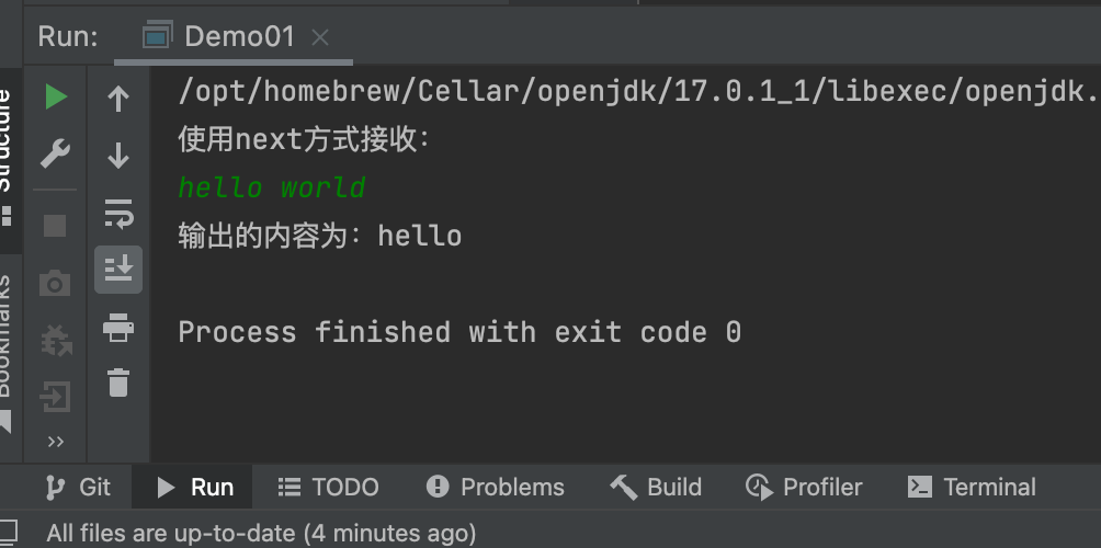 对输入有效字符之前遇到空白,next()方法会自动将其去掉。例如:输入【hello world】只会输出【hello】