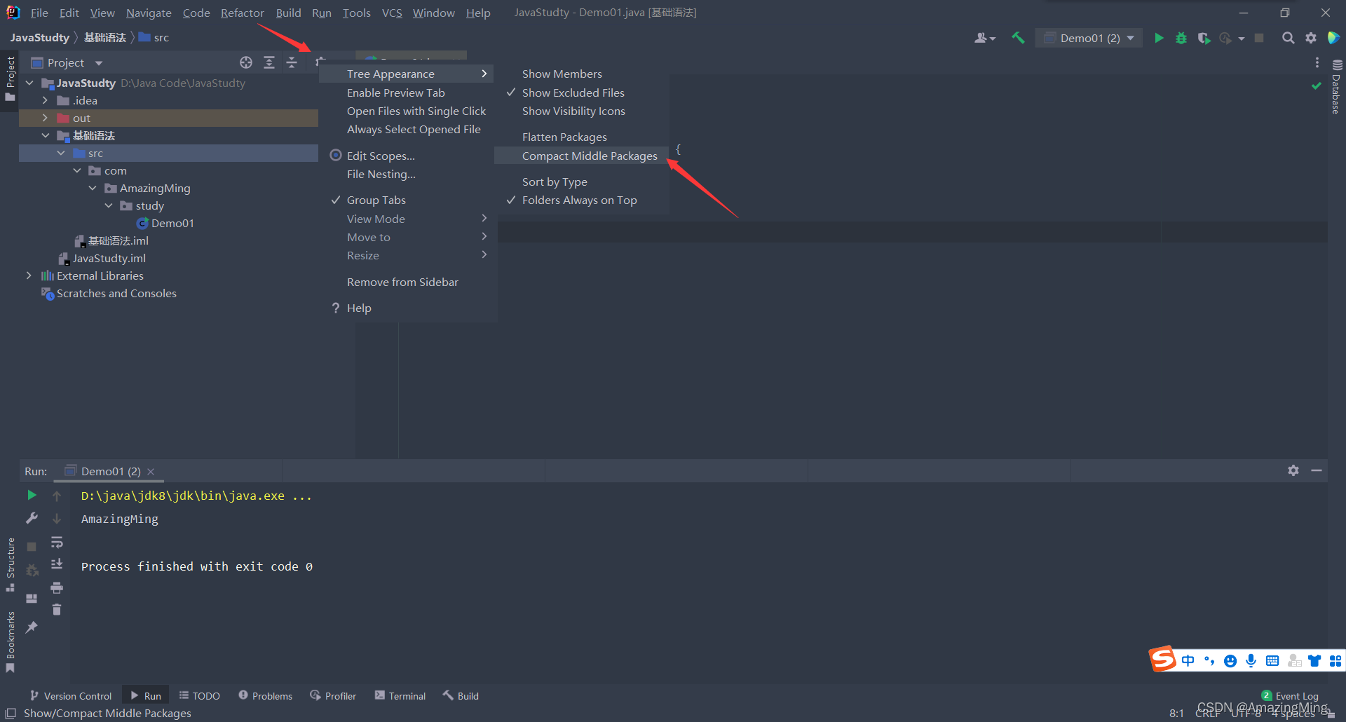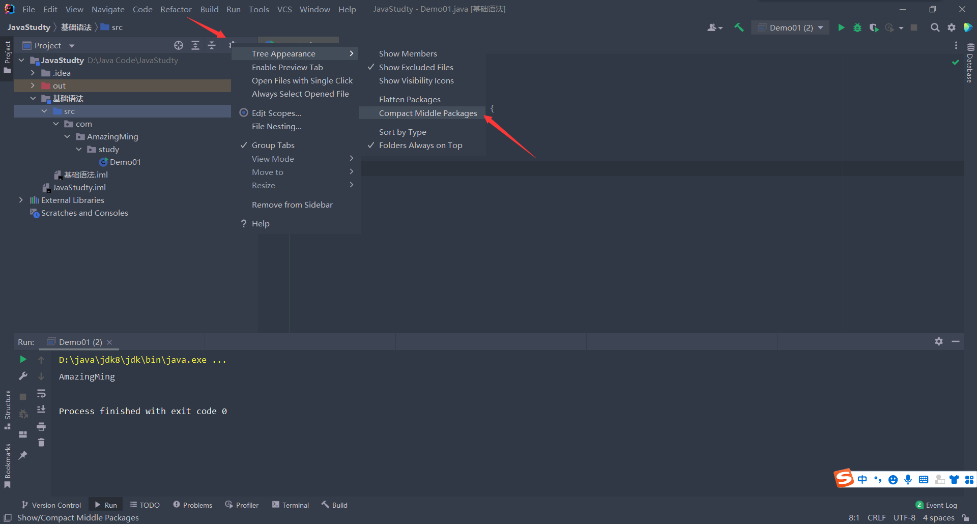 ②包中包不会显示多层级,这时我们需要点击旁边的小齿轮,选择Tree Appearance,取消勾选Compact Middle Packages即可。