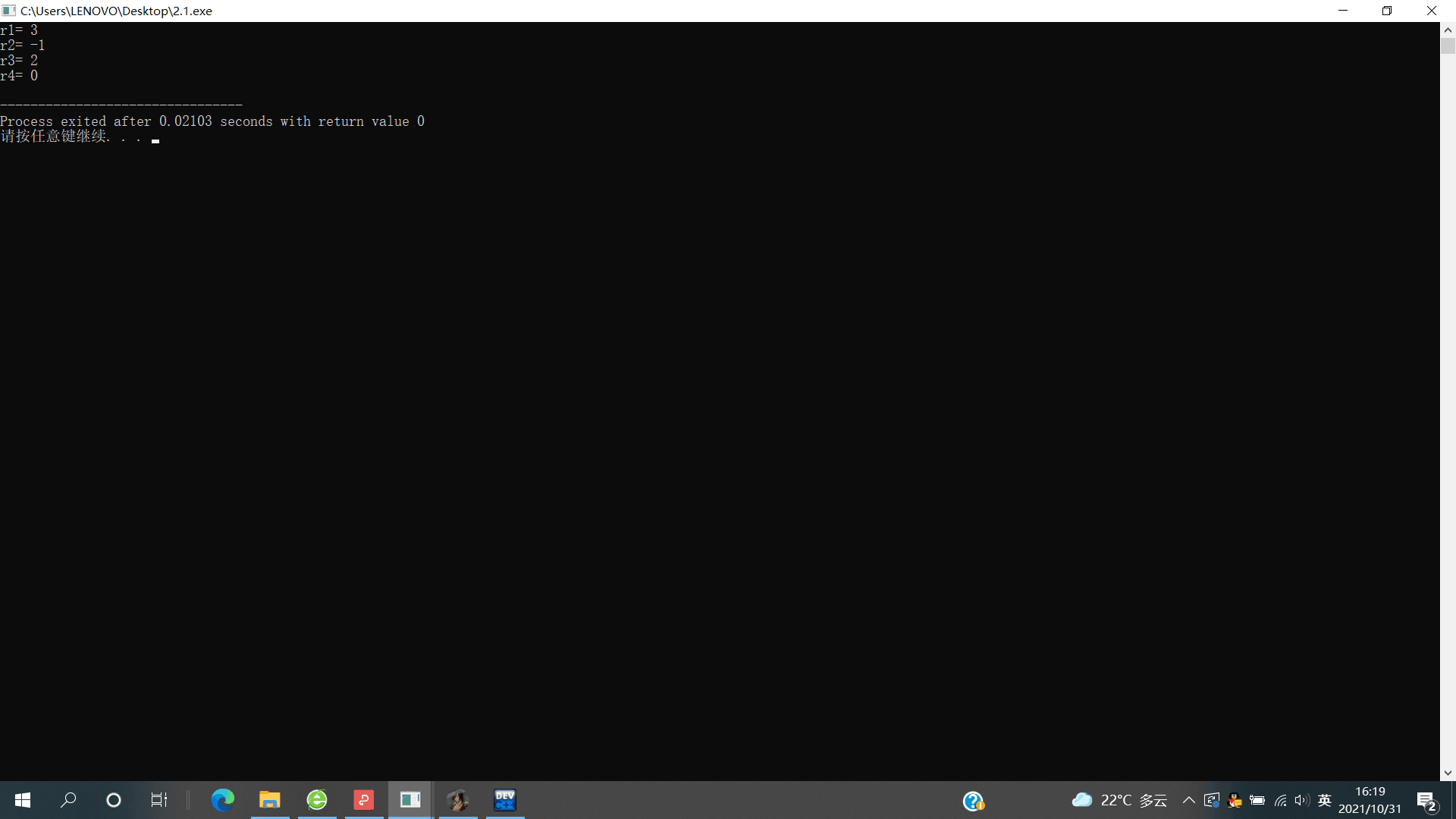 #include<stdio.h> int main() { int x,y; int r1, r2, r3, r4; x=1; y=2; r1=x+y; r2=x-y; r3=x*y; r4=x/y; printf("r1= %d\n", r1); printf("r2= %d\n", r2); printf("r3= %d\n", r3); printf("r4= %d\n", r4); return 0; }