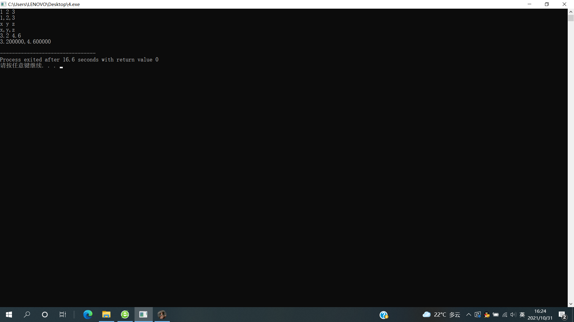 #include<stdio.h> int main() { double x,y; char c1, c2, c3; int a1,a2,a3; scanf("%d%d%d",&a1,&a2,&a3); printf("%d,%d,%d\n",a1,a2,a3); scanf(" %c %c %c",&c1,&c2,&c3); printf("%c,%c,%c\n",c1,c2,c3); scanf("%lf%lf",&x,&y); printf("%lf,%lf\n",x,y); return 0; }