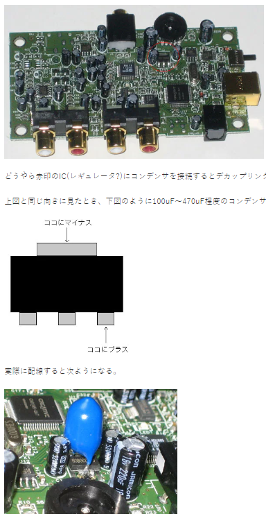 已经有人介绍过Digital Music的改造方法,我决定效仿。似乎只要将电容连接到带有红色标记的IC(可能是稳压器)上,就可以实现去耦。从上图的方向看,如下图所示,连接一个100uF到470uF左右的电容即可。实际布线如下图所示。