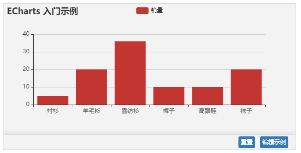 然后就可以通过 echarts.init 方法初始化一个 echarts 实例并通过 setOption 方法生成一个简单的柱状图,下面是完整代码。
