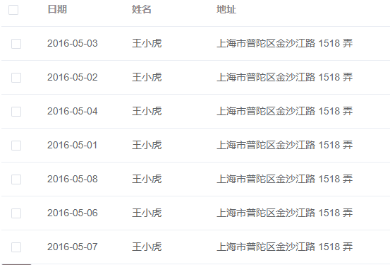 data() { return { tableData: [ { date: "2016-05-03", name: "王小虎", address: "上海市普陀区金沙江路 1518 弄", className: "normal", }, { date: "2016-05-02", name: "王小虎", address: "上海市普陀区金沙江路 1518 弄", className: "normal", }, { date: "2016-05-04", name: "王小虎", address: "上海市普陀区金沙江路 1518 弄", className: "normal", }, { date: "2016-05-01", name: "王小虎", address: "上海市普陀区金沙江路 1518 弄", className: "normal", }, { date: "2016-05-08", name: "王小虎", address: "上海市普陀区金沙江路 1518 弄", className: "normal", }, { date: "2016-05-06", name: "王小虎", address: "上海市普陀区金沙江路 1518 弄", className: "normal", }, { date: "2016-05-07", name: "王小虎", address: "上海市普陀区金沙江路 1518 弄", className: "normal", }, ], };
