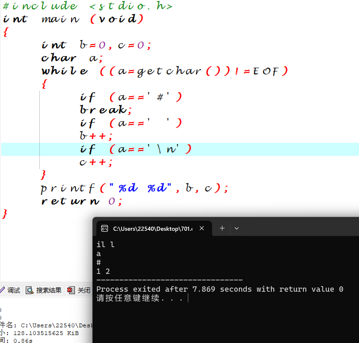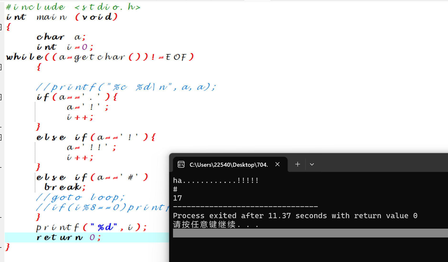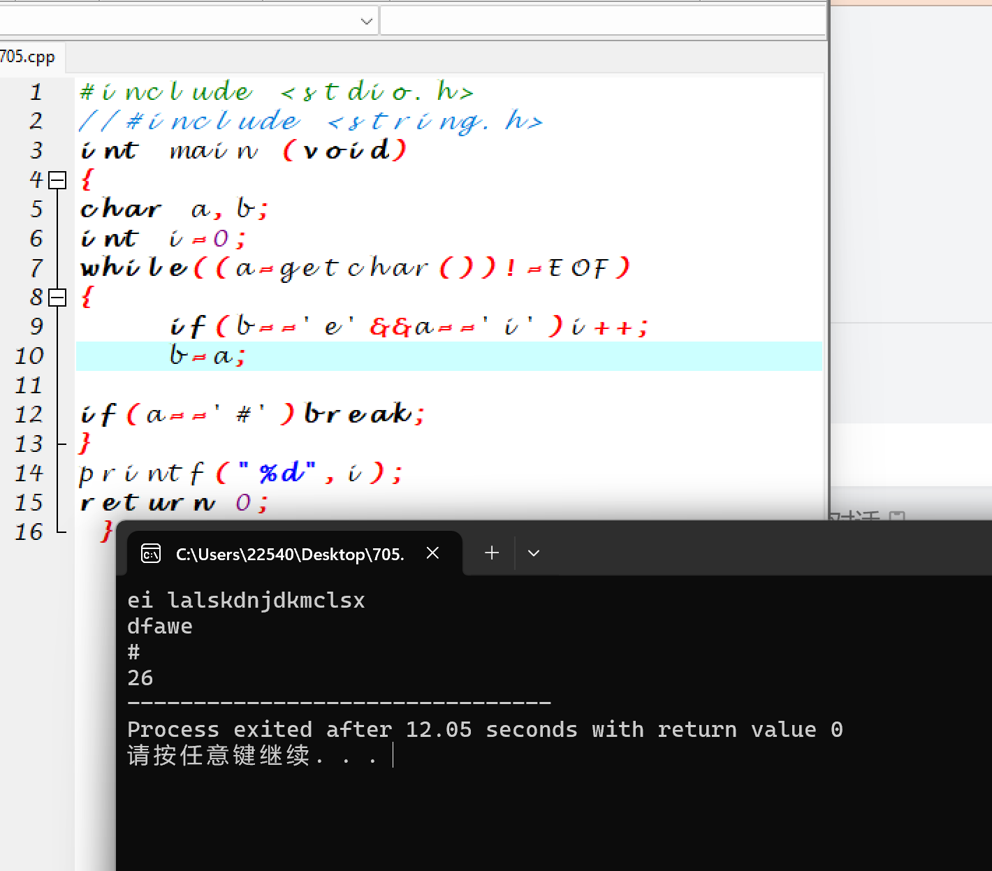 学到了巧妙的方法判断双字符并报告次数,使用getchar函数逐个读取输入字符,通过比较当前字符和前一个字符来统计"ei"的出现次数。