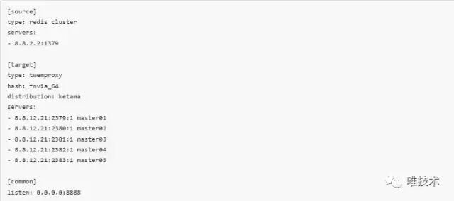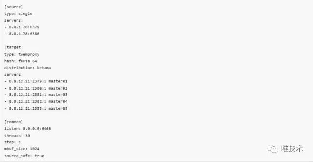目标集群,因为不同数据分布规则需要执行不同的写入逻辑,因而配置非常严谨。特别是tw集群,迁移到目标集群的server配置需要和twemproxy中保持一致,包括hash算法、数据分布算法、节点的ip和port、权重、节点的名字。