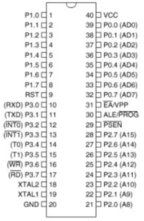 图是传统8051单片机的引脚图,借古观今,现在我们使用的单片机兼容了曾经的设计,增加功能,速度更快。由图可知,这些引脚分为了很多组,有P0、P1、P2、P3和其他。其中,P开头这些引脚,可以直接由程序控制它们的输出或者读取它们的输入,有些引脚标注上还带有括号,表明它们具有第二功能。