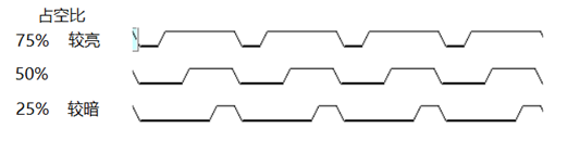 人眼能察觉到的,发生变化的时间,大约是1/60s,凑个整算1/100s吧(这里对时序要求不严格)。如果能在人眼察觉不到的情况下,让小灯"闪烁",那么灯的亮度看起来就会减弱。目前,这种常用的调节LED小灯的方式,称之为PWM脉冲宽度调制。它的原理是,在周期不变的情况下调节高电平占整个周期时常的百分比(占空比),示意图如图所示。请同学们尝试编写相关代码。(由于P35端口第二功能只有时钟输出功能,没有直接的PWM输出功能,可用时钟输出功能稍加设置输出PWM波形,具体请看芯片手册第2章、第7章)
