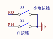开发板上有两个按钮,一个在屏幕下方,一个在侧面,原理图如图所示。当按钮按下时,按钮导通,P33或P14被拉低至低电平。这里,P14端口具有外部中断功能,我们通过设定一些SFR,使得按下按钮,小灯切换亮灭状态。