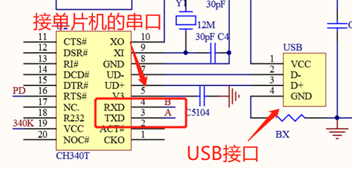 串口是一种常见的通讯端口,原理图如图所示。单片机串口与CH340T芯片连接,CH340T芯片和USB的差分信号线D+D-相连。现在的家用计算机上大多没有直接的串口了,只有常见的USB接口。这里,CH340T芯片的功能,则是将串口通讯的UART协议、单片机的TTL电平转换为USB协议、电平,使得PC机(上位机)可以和单片机通讯。