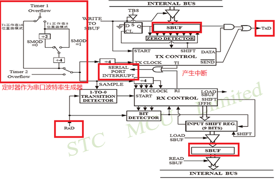 图中,左上角部分接单片机的定时器,定时器产生串口所需的波特率。右上角为发送部分,向SBUF寄存器中写入数据即可发送,并将TI置1,产生中断;右下角为接收部分,当中断产生,RI置1时,即可向SBUF寄存器读取数据,得到接收的数据。