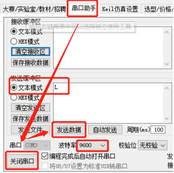 下载软件带有串口调试助手,使用方法如图所示。