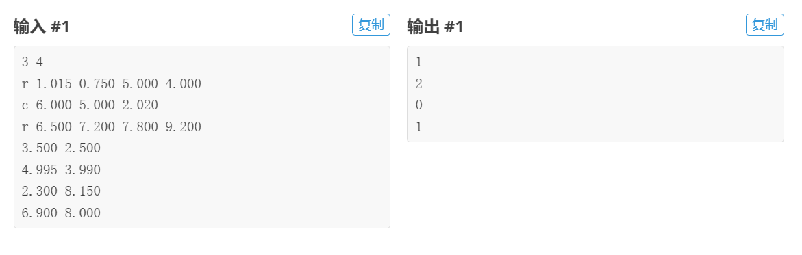从文件input.txt中读入数据,文件第一行为两个正整数N和M,其中N表示有多少个图形(矩形或圆),M表示有多少个点。接下来的N行是对每个图形的描述,具体来说,第i+1行表示第i个图形。先是一个字母,若该字母为“r”,则表示该图形是一个矩形,这时后面将有4个实数x1,y1,x2,y2,表示该矩形的一对对角顶点的坐标分别为(x1,y1)和(x2,y2);若该字母为“c”,则表示该图形是一个圆,这时后面将有3个实数x,y,r,表示该圆以(x,y)为圆心并以r为半径。最后M行是对每个点的描述,其中每行将有两个实数x,y,表示一个坐标为(x,y)的点。