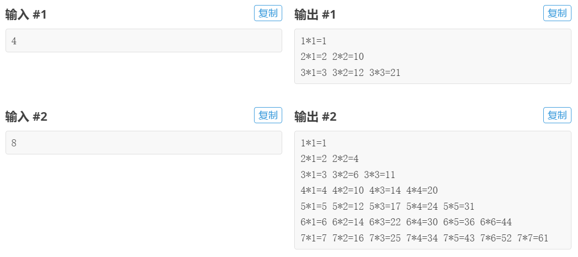 请注意,乘法表中两个数相乘的顺序必须为样例中所示的顺序,不能随意交换两个乘数。
