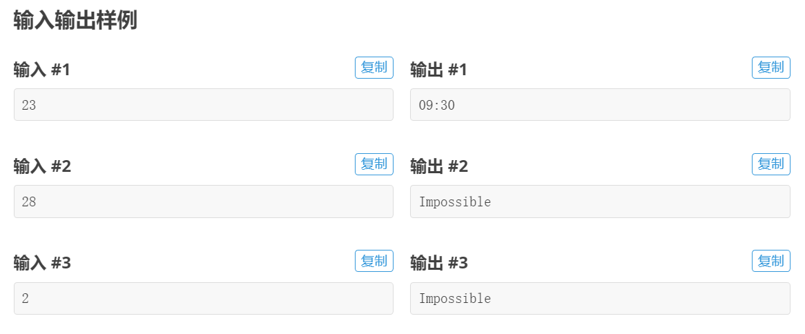 输出一个字符串,如果有合法的时间满足输入的段数,则输出这个时间(有多个输出任意一个均可),否则输出Impossible