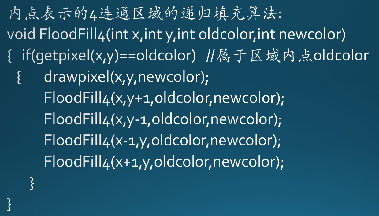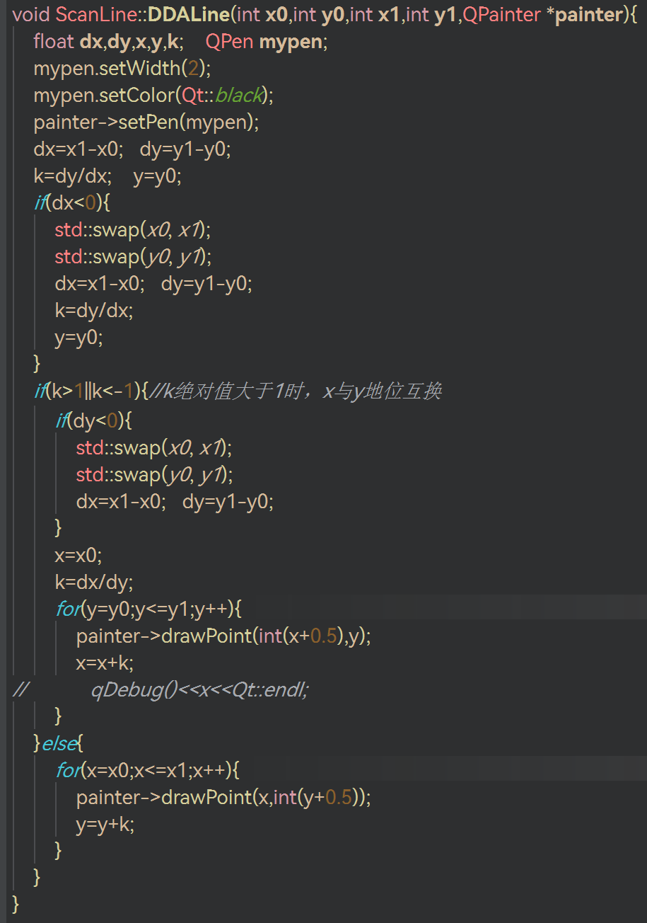 void DDA(int x0,int y0,int x1,int y1){ int x; float dx,dy,y,k; dx=x1-x0,dy=y1-y0; k=dy/dx; //yi+1=yi+k; y=y0; for(x=x0;x<=x1;x++){ draw(x,int(y+0.5)); y+=k; } }