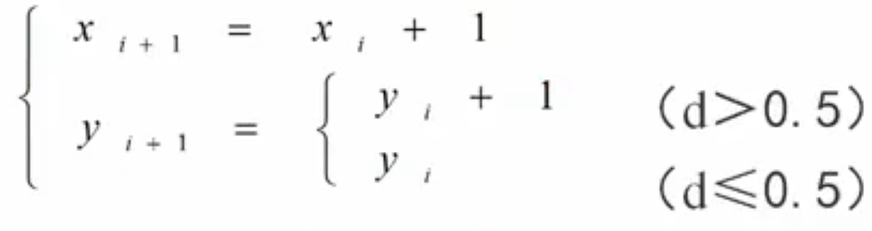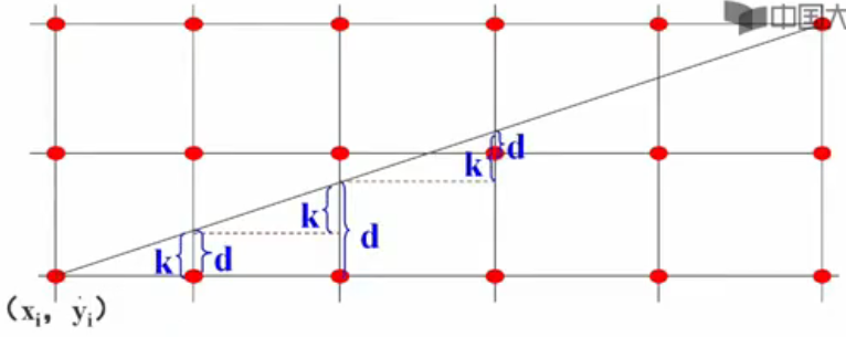 该算法的思想是通过各行、各列像素中心构造一组虚拟网格线,按照直线起点到终点的顺序,计算直线与各垂直网格线的交点,然后根据误差项的符号确定该列象素中与此交点最近的像素。
