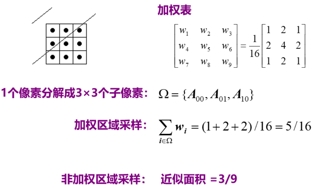 - 像素的亮度与相交区域的面积成正比,而与相交区域落在像素内的位置无关,这仍然会导致锯齿效应