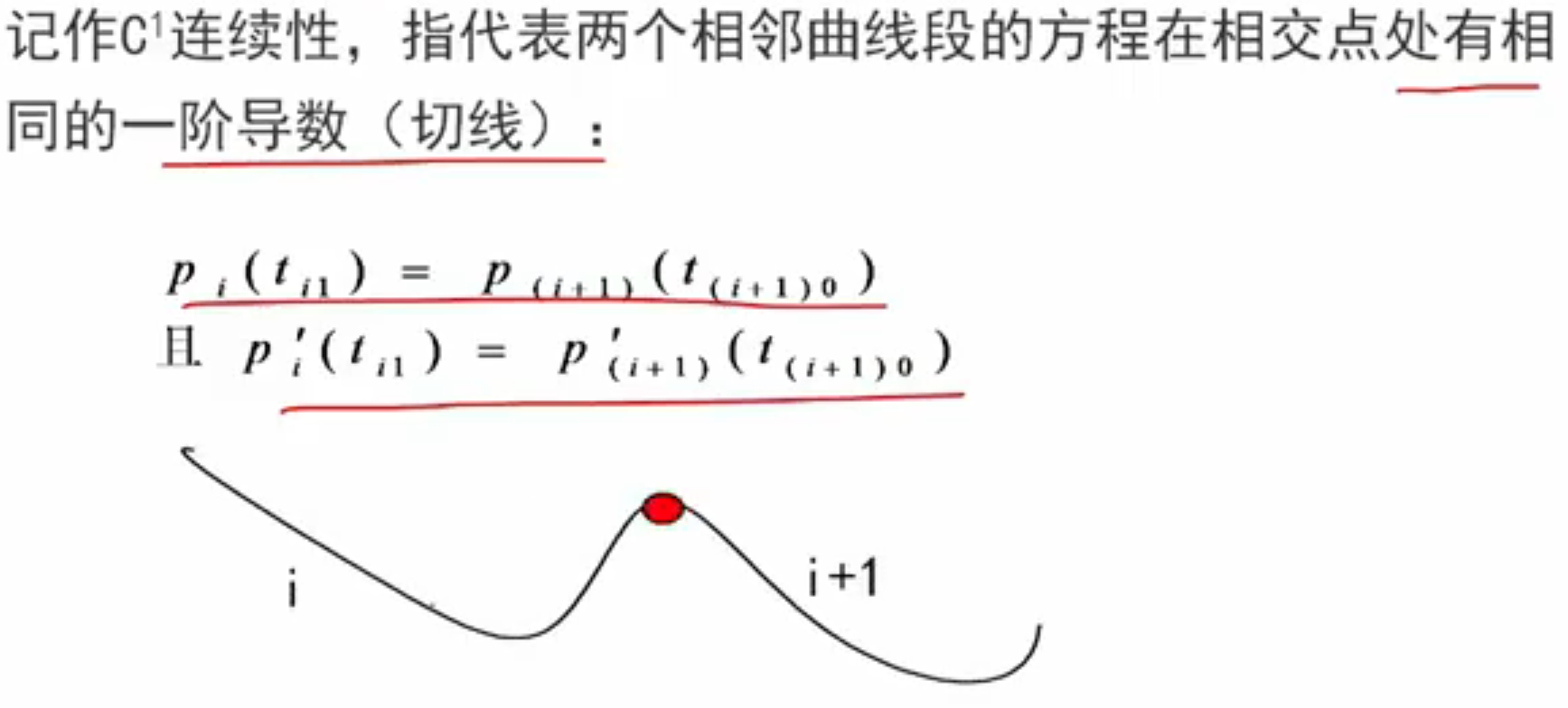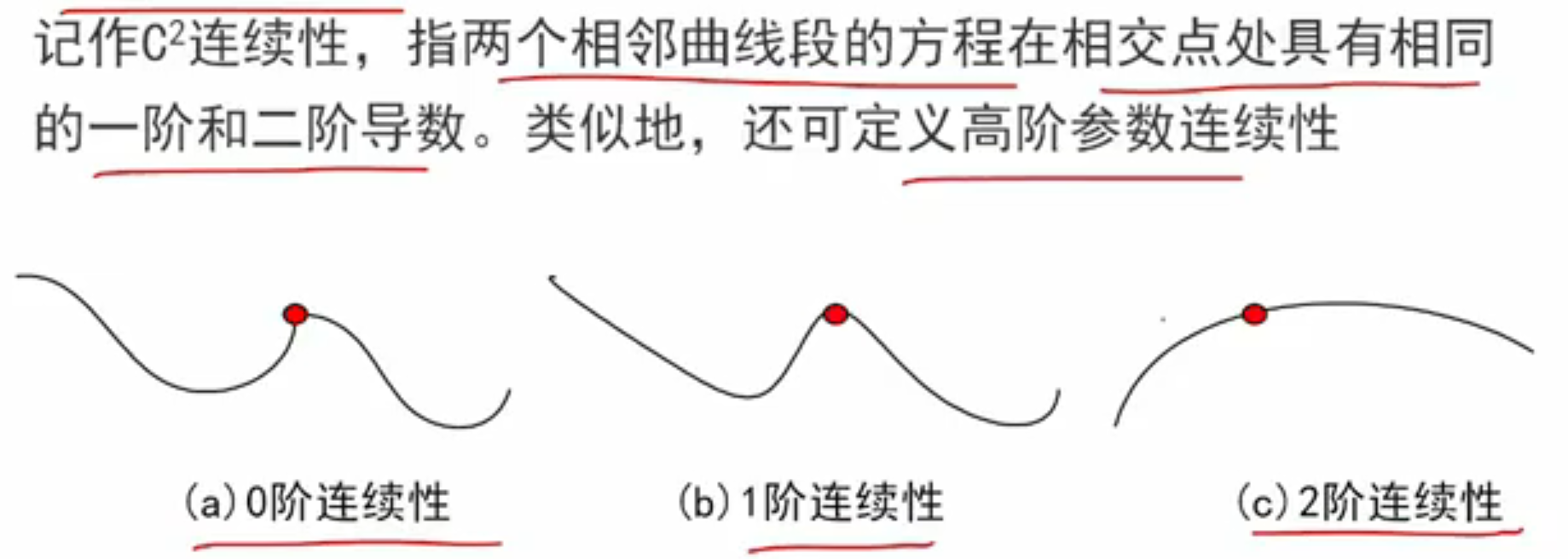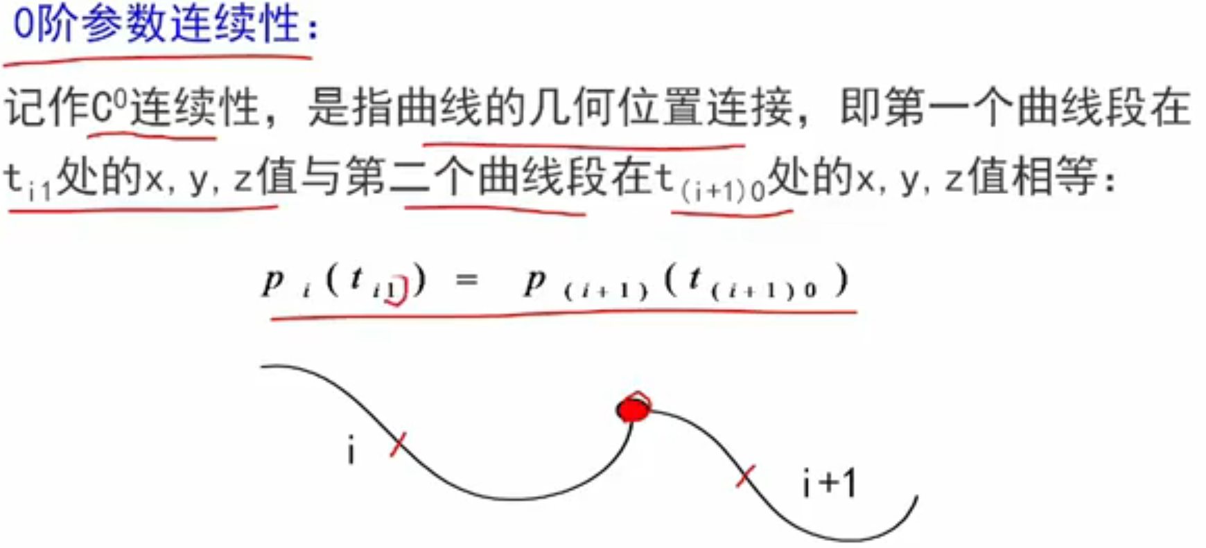① 函数的可微性:组合参数曲线在连接处具有直到n阶连续导矢,即n阶连续可微,这类光滑度称之为C的n次方或n阶参数连续性