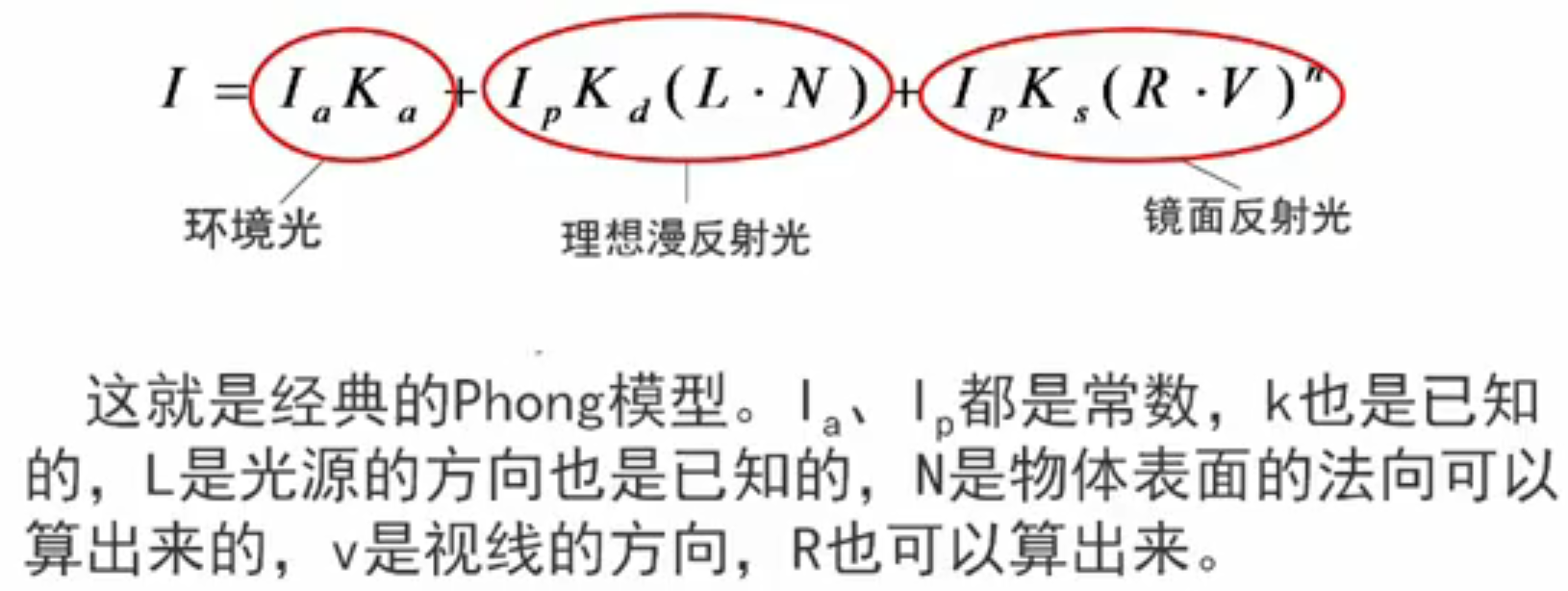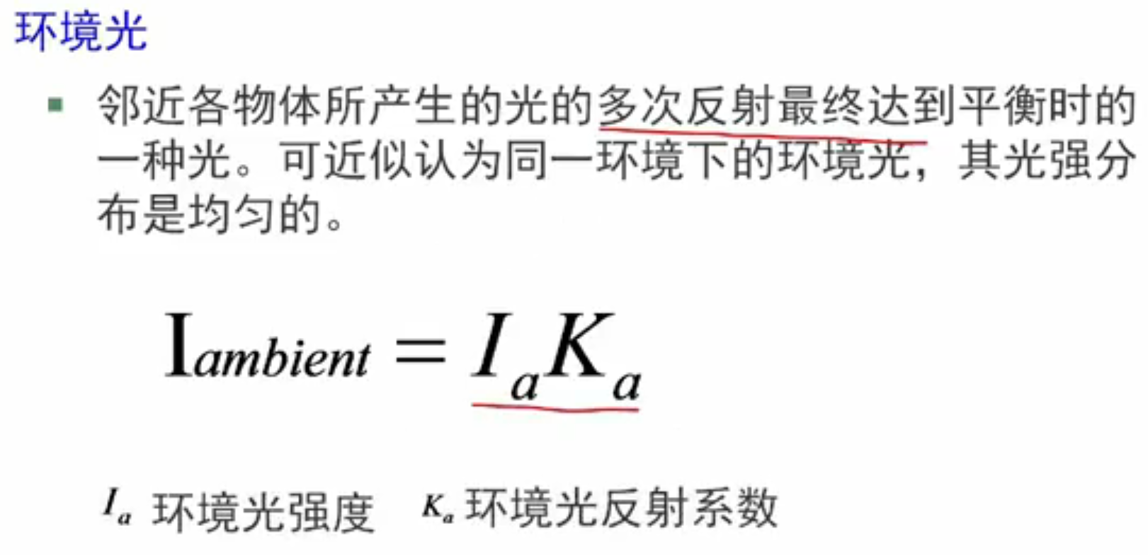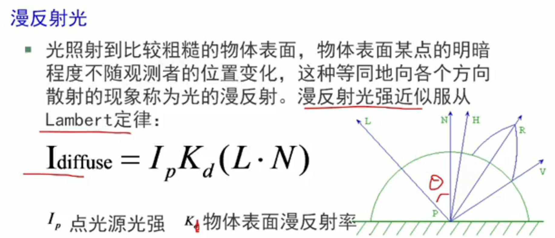 对于暴露在环境光下的Lambert反射体,可以用以下公式表示某点处的漫发射光强: