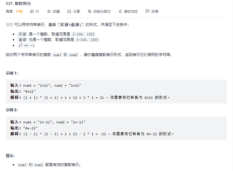 class Solution { public: string complexNumberMultiply(string num1, string num2) { int a1,a2; int b1,b2; const char* a = num1.c_str(); const char* b = num2.c_str(); sscanf(a,"%d+%di",&a1,&b1); sscanf(b,"%d+%di",&a2,&b2); char* res=(char*)malloc(sizeof(char)*13); sprintf(res,"%d+%di",a1*a2-b1*b2,a1*b2+a2*b1); return res; } };