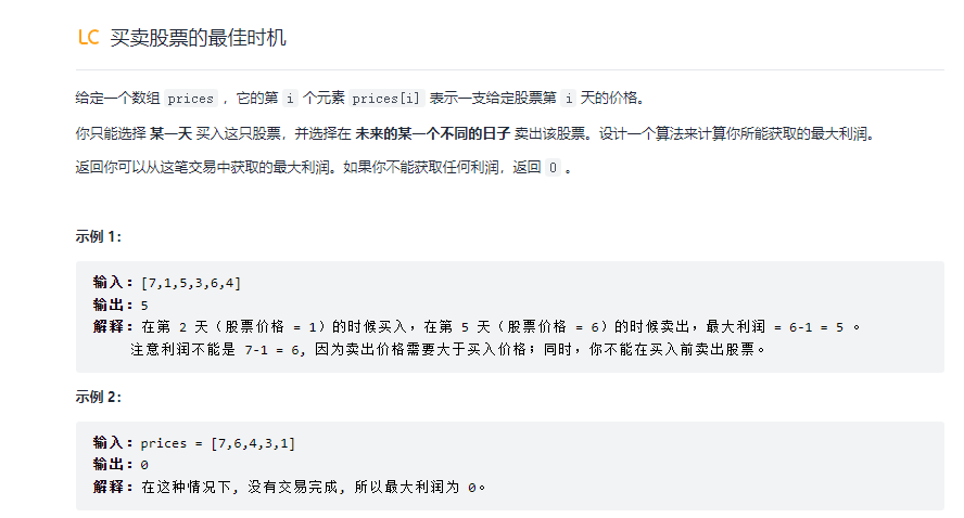 思路是 定义一个最大差值量和最小元素量,遍历一次数组,每次记录最大差值和最小元素,最后返回最大差值即可,两题如出一辙。