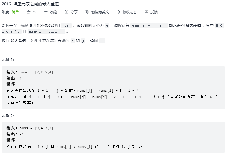 【力扣每日打卡】2022.2.26 增量元素之间的最大差值