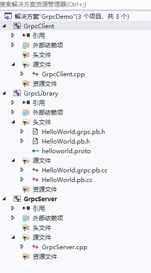 1,新建三个VC项目,如下图,其中GrpcServer, GrpcClient 为控制台(console)程序, GrpcLibrary为静态库