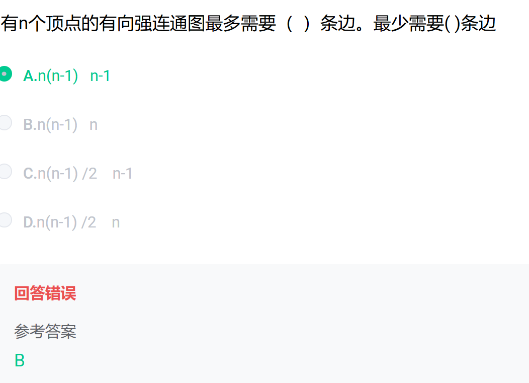 有向强连通图要求图中任意两个顶点u和v,都存在从u到v和从v到u的路径。对于n个顶点的有向强连通图,最少边数的情况是构成一个有向环,即n条边,这样能保证任意两个顶点之间都有路径可达。