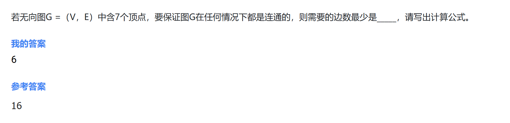 任何情况,是指7个顶点的边是怎么连接都可以,而不是度为1这种连边方式。所以为了保证任何情况都连通。则前6个顶点必须是完全连通图,第7个顶点和这个连通图任一个顶点有一条连边即可。计算公式:
