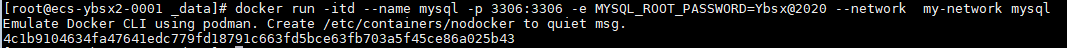 $ docker run -itd --name mysql -p 3306:3306 -e MYSQL_ROOT_PASSWORD=Ybsx@2020 --network my-network mysql