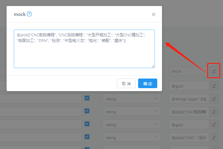2、添加子节点,输入名称、类型、备注,在mock栏中根据mock.js文档选择需要的数据占位符。