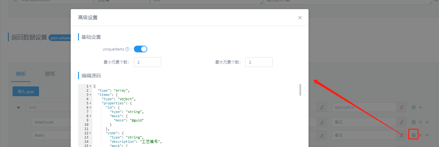 4、查询列表接口:点击items右侧设置按钮,打开高级设置面板,将开关打开,使得列表项每个元素都不相同,最小元素个数和最大元素个数控制列表项个数,可以统一为totalCount的值。