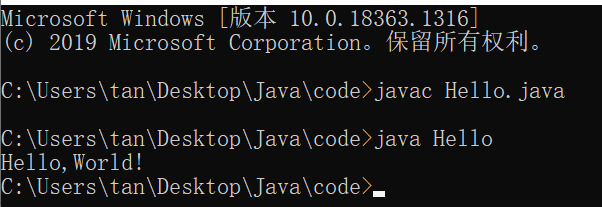 5.然后在cmd继续输入java Hello-回车-下方出现Hello,World!-恭喜你成功了!!!QAQ