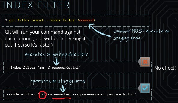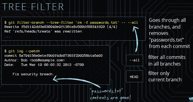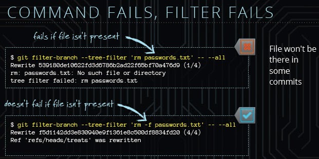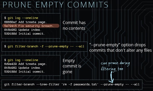 Great! Now we're getting somewhere. There is one more problem though, you realize that some of the commits don't contain anything anymore, since you removed the password file that they referenced. You should probably use the --prune-empty option do something to clean these out.