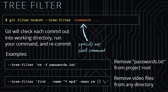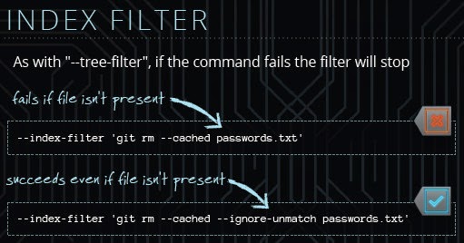 Great! Now we're getting somewhere. There is one more problem though, you realize that some of the commits don't contain anything anymore, since you removed the password file that they referenced. You should probably use the --prune-empty