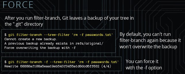 file that should probably be removed too, just to be safe. Use either technique you have learned to remove this file. Don't forget, you have a history backup from the first time you used filter-branch