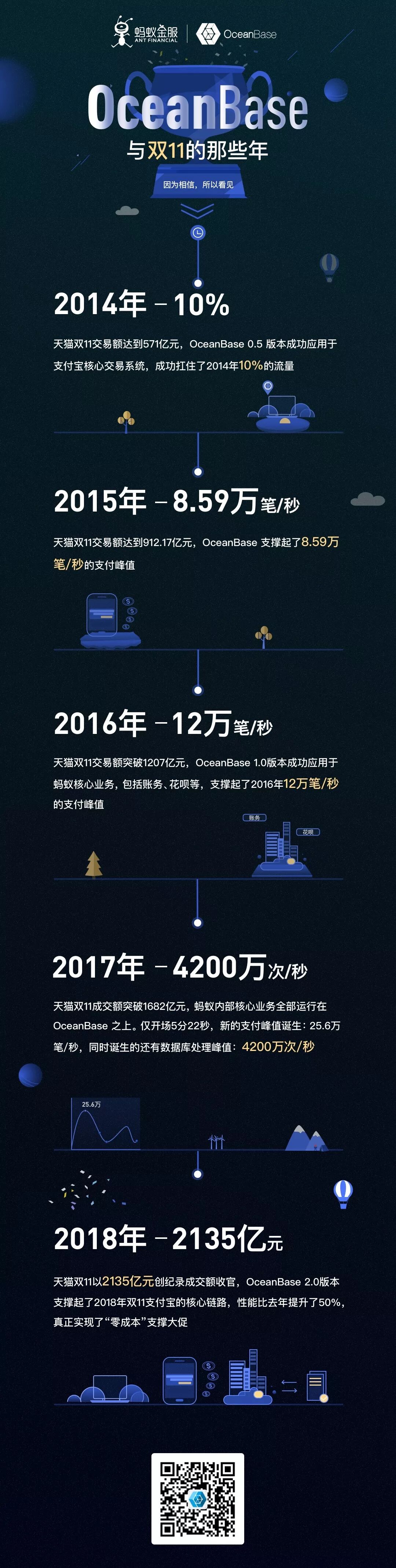 2014年双11的零时之后,出现了285万笔/分钟的交易峰值,这个数值是2013年峰值的3倍多。最后2014年的天猫双11交易额达到571亿元,OceanBase 0.5 版本成功应用于支付宝核心交易系统。
