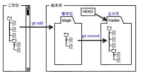 git的版本库里存了很多东西,其中最重要的就是称为stage(或者叫index)的暂存区,还有git为我们自动创建的第一个分支master,以及指向master的一个指针叫HEAD。构造参见上面的结构图。