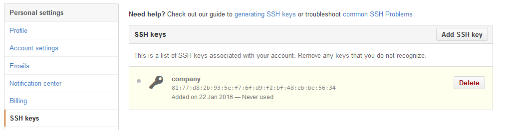 打开"Account settings"->"SSH Keys"页面,然后点击"Add SSH Key",在Key文本框中粘贴id_rsa.pub公钥文件的内容,点击"Add Key",就可以看到刚添加的key了。