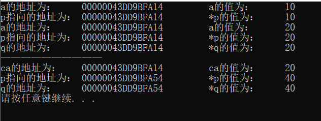 cout << "ca的地址为:\t" << &a << "\t ca的值为: \t" << a << endl;