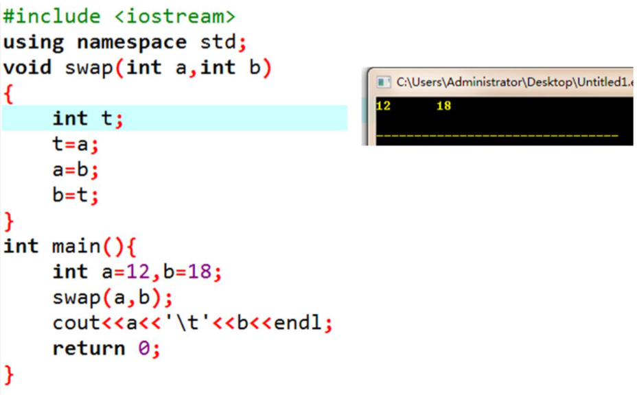 这里a,b为局部变量,只是将 a,b的值拷贝给了 形参,但并不影响实参a,b的值,所以结果是a=12,b=18.