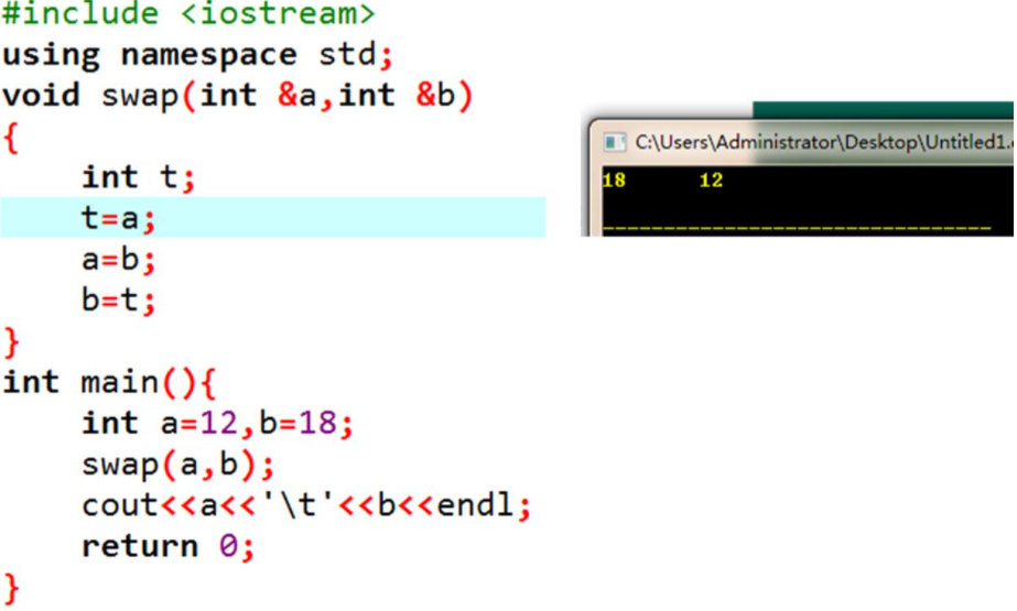 如果函数的形参是引用,则调用时实参传递给形参采用的是传引用的方式。函数调用时,实参对象名传递给形参对象名,形参对象名就成为实参对象名的别名,