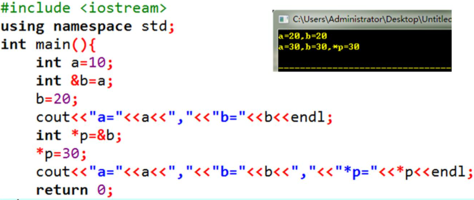 * 引用相当于给变量起一个别名。变量对应于某个内存地址,如果给某个变量起了别名,相当于变量和引用都对应到同一个地址。